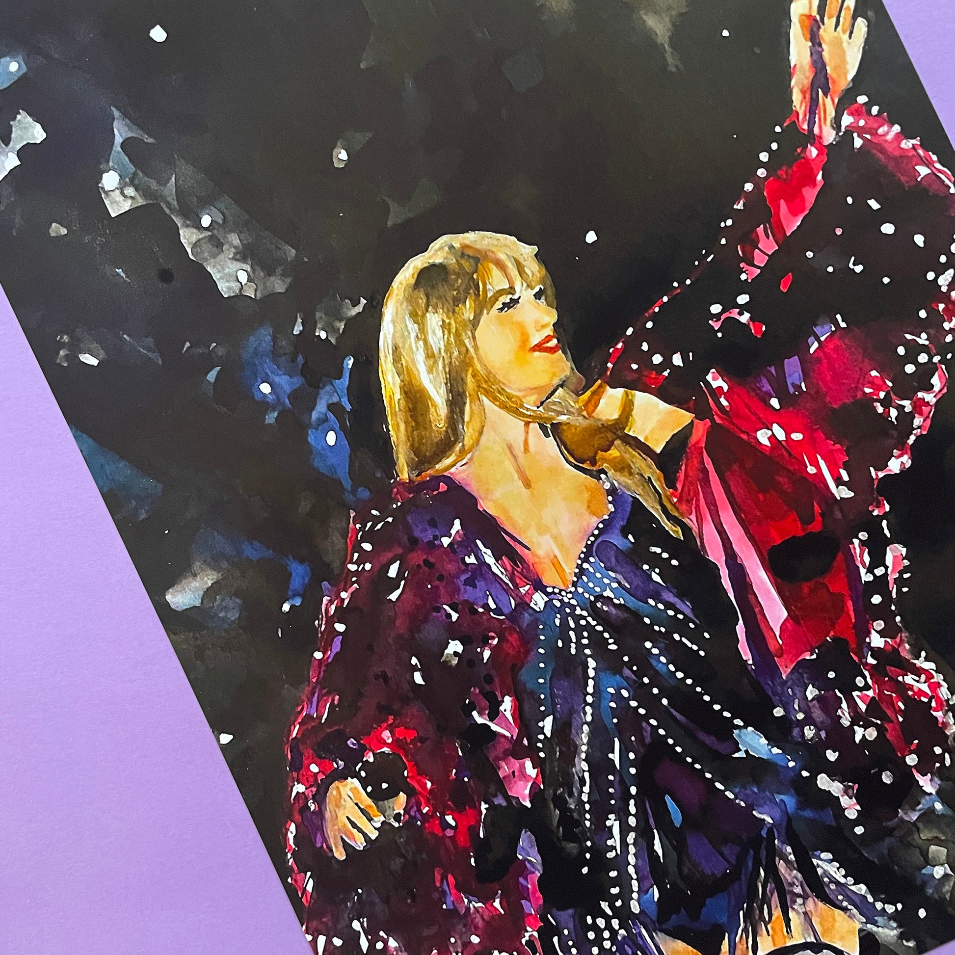 A vibrant art print inspired by Taylor Swift’s Eras Tour, capturing all the sparkle and confidence of that unforgettable moment. Painted in my signature illustrative style with rich magentas, purples, and inky blacks, it’s a joyful celebration of bold women and iconic fashion — part of my Icons Collection.