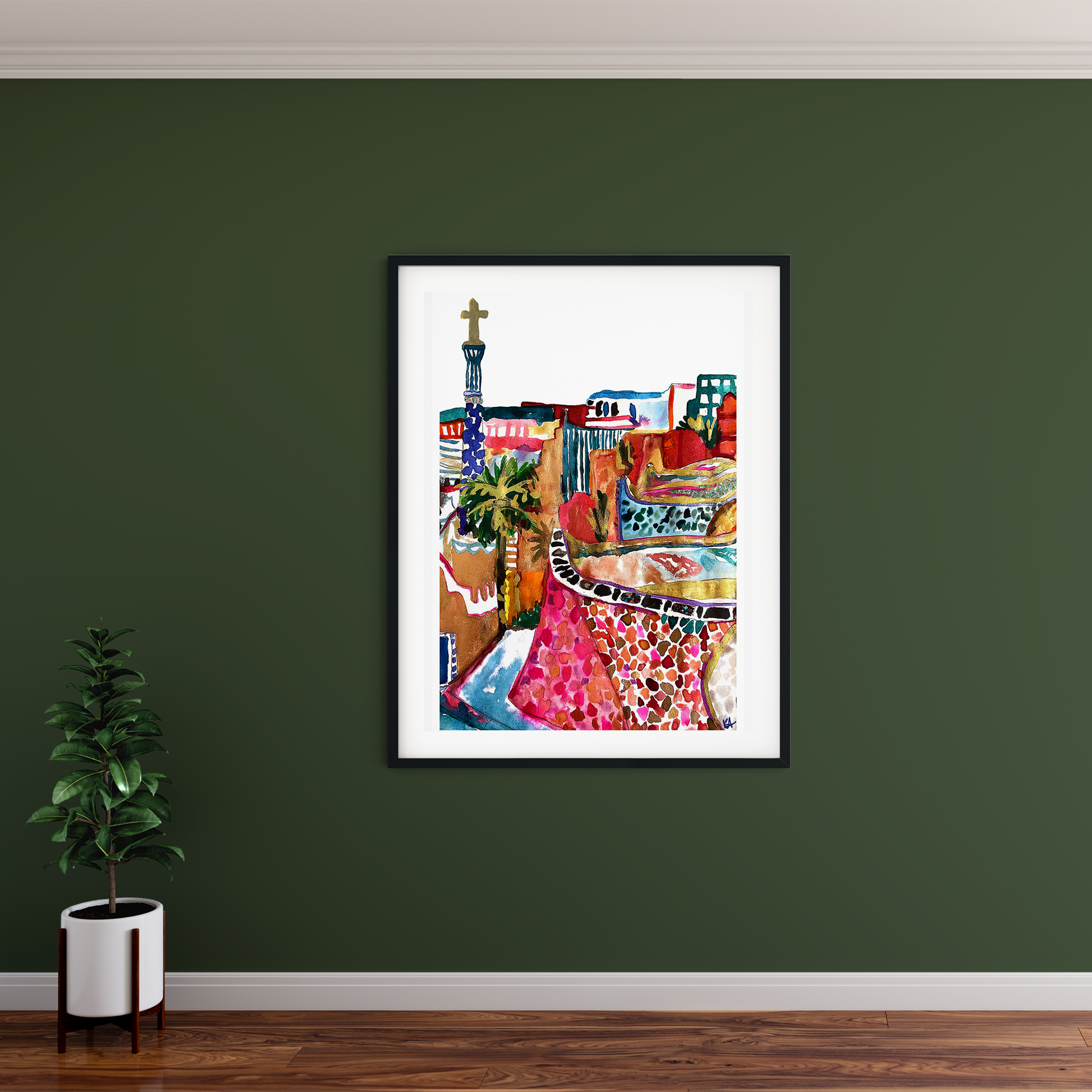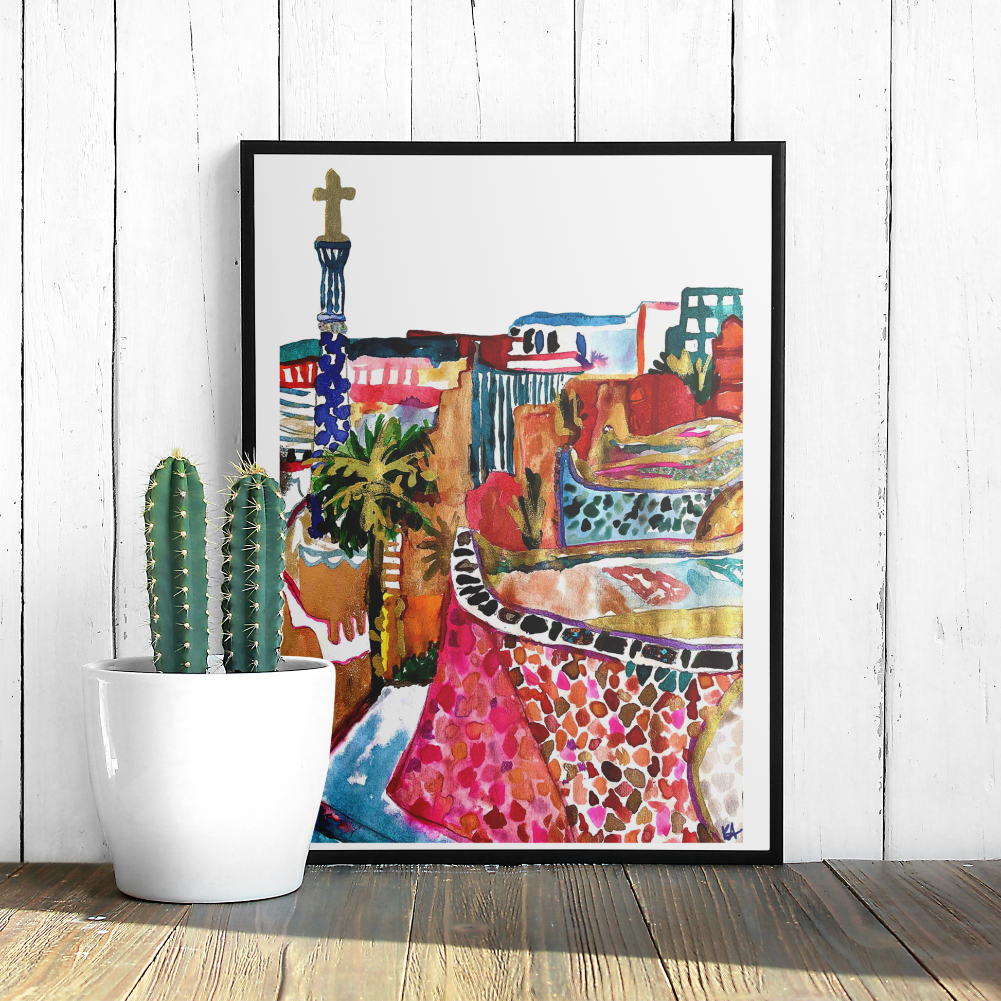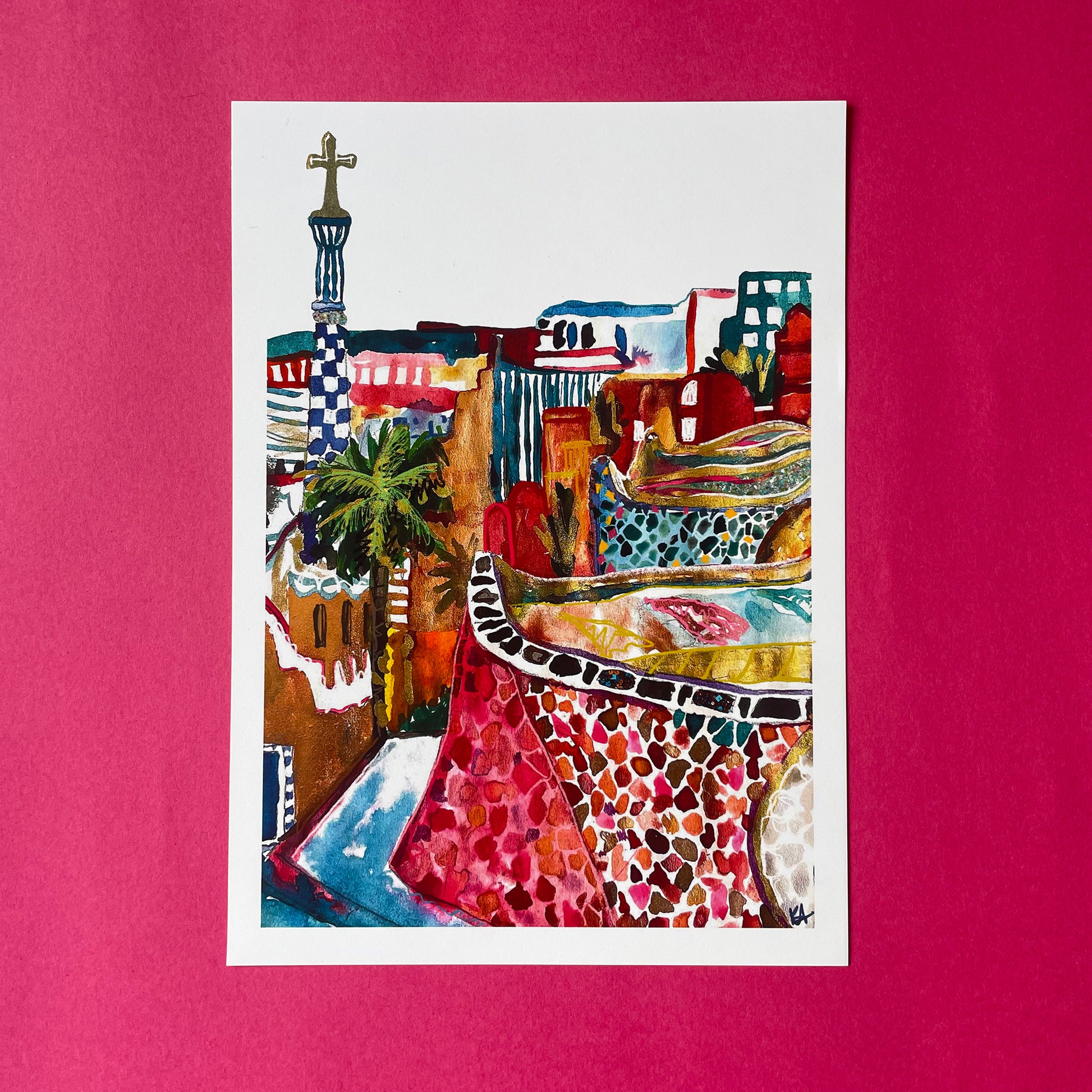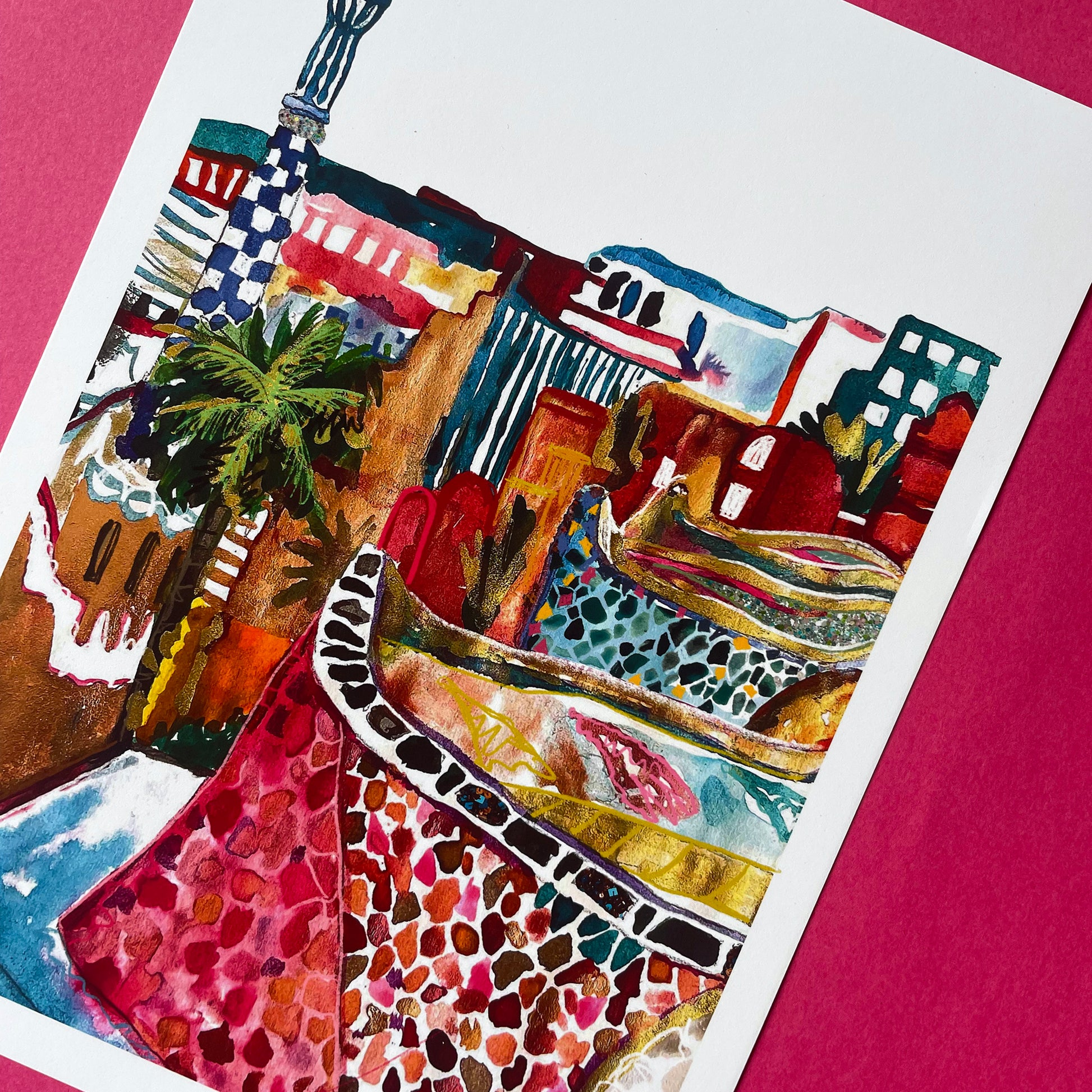 Bursting with colour, texture and sunshine, this joyful art print is inspired by my travels to the vibrant city of Barcelona. Featuring the iconic mosaic curves and whimsical architecture of Park Güell, this piece captures the spirit of Gaudí’s creativity and the magic of a city where art lives in every corner.