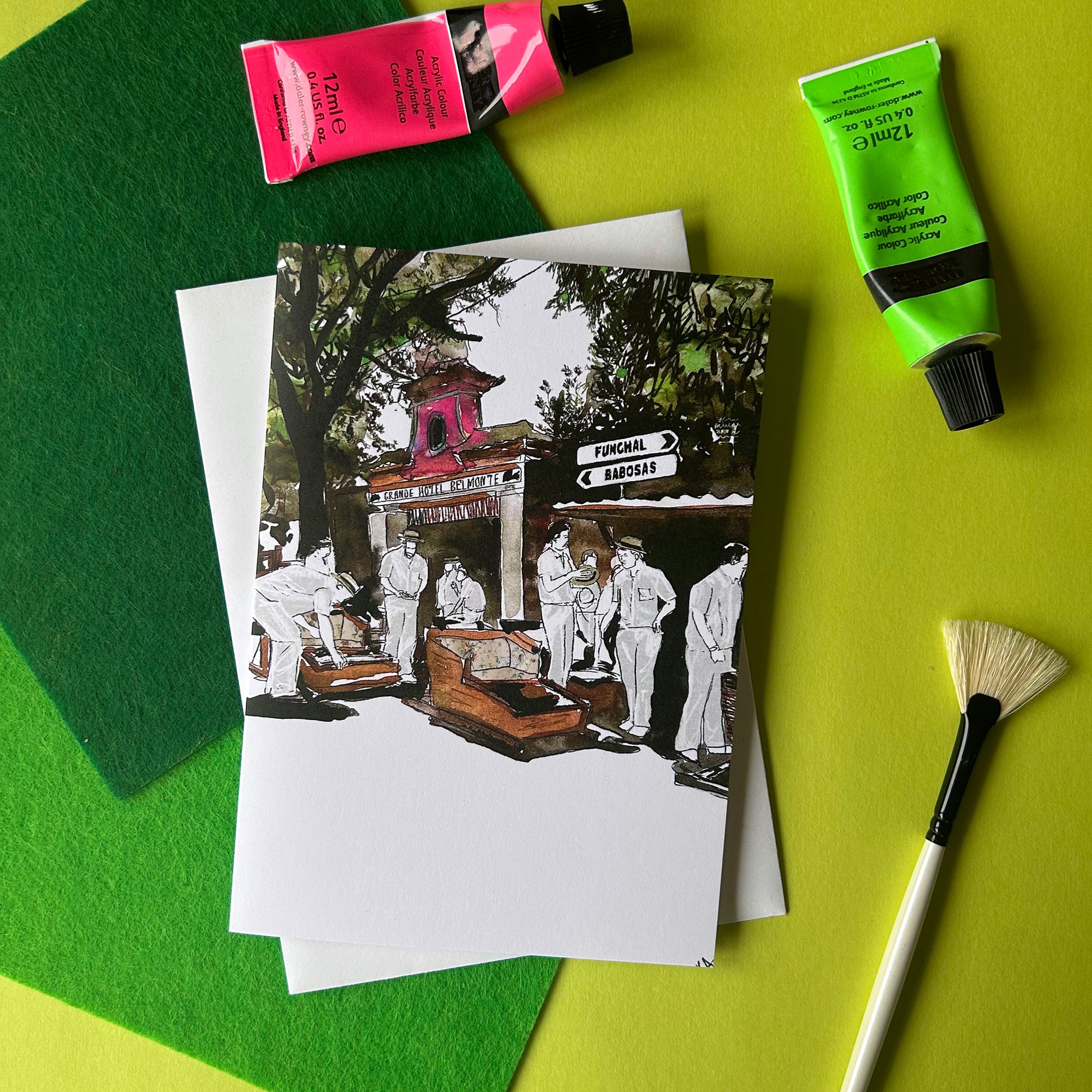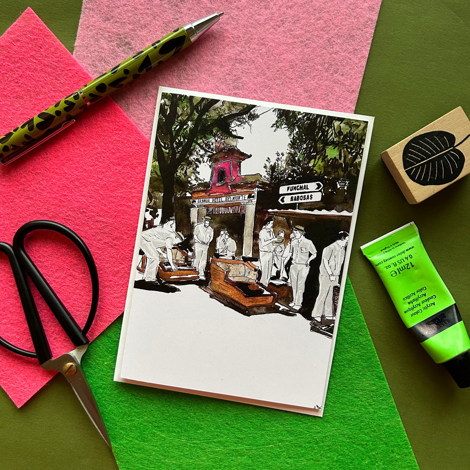 Illustrated art card inspired by the unique tradition of the Carreiros do Monte. Inspired by my travels to Madeira, this piece brings to life the iconic wicker toboggans and the white-clad men who guide them down the winding hills of Funchal.