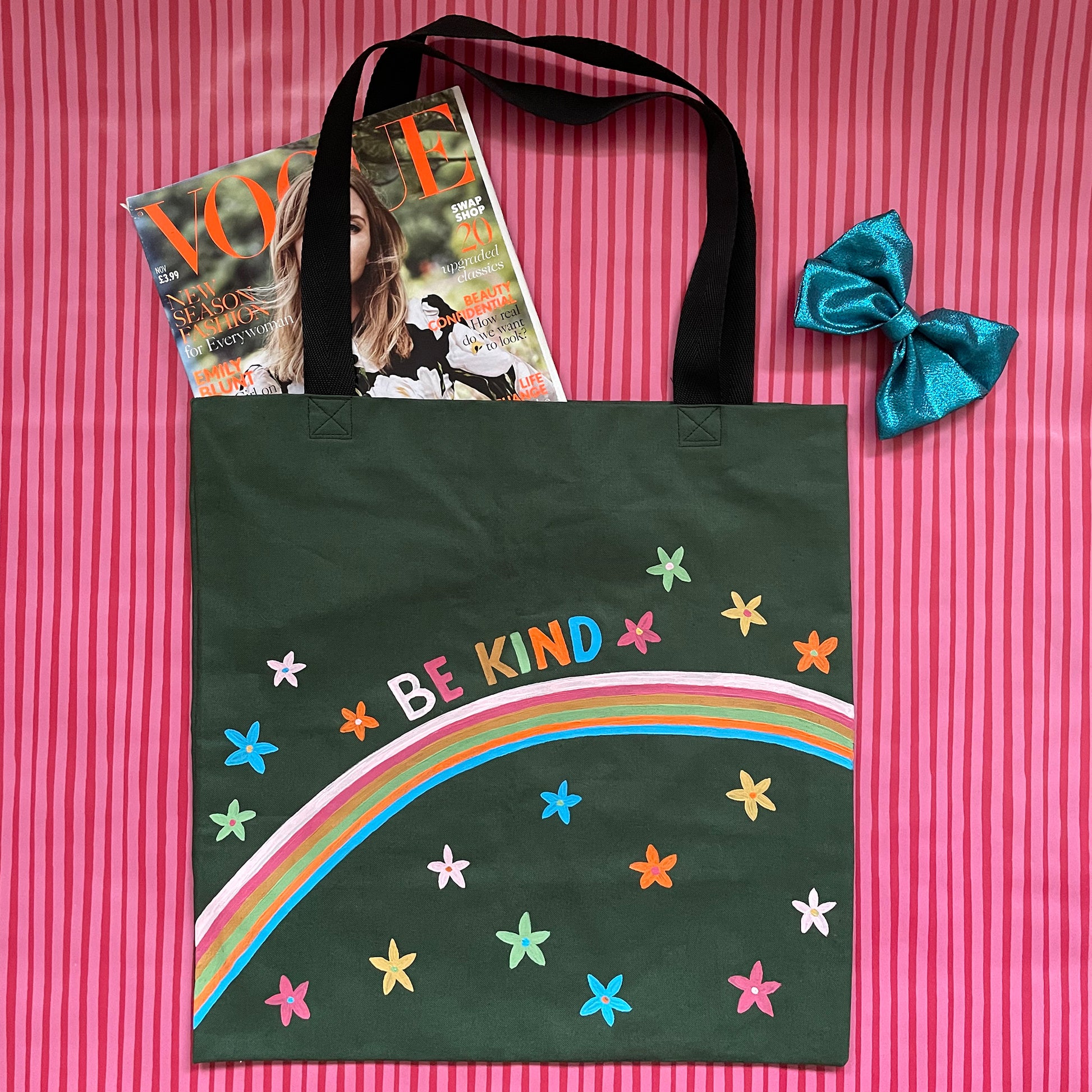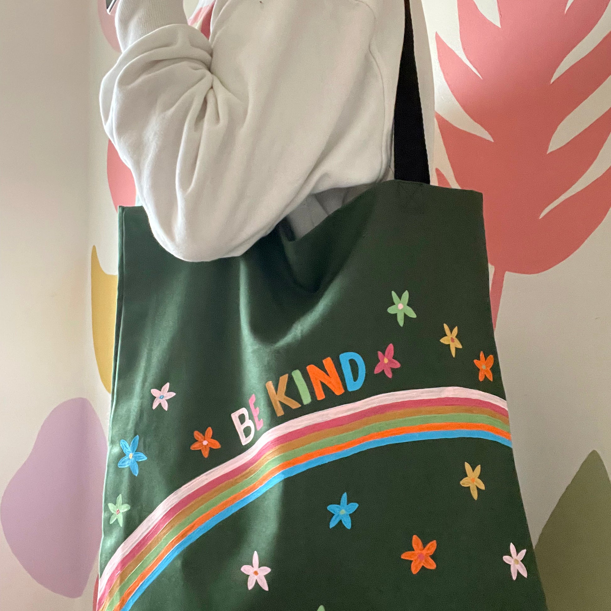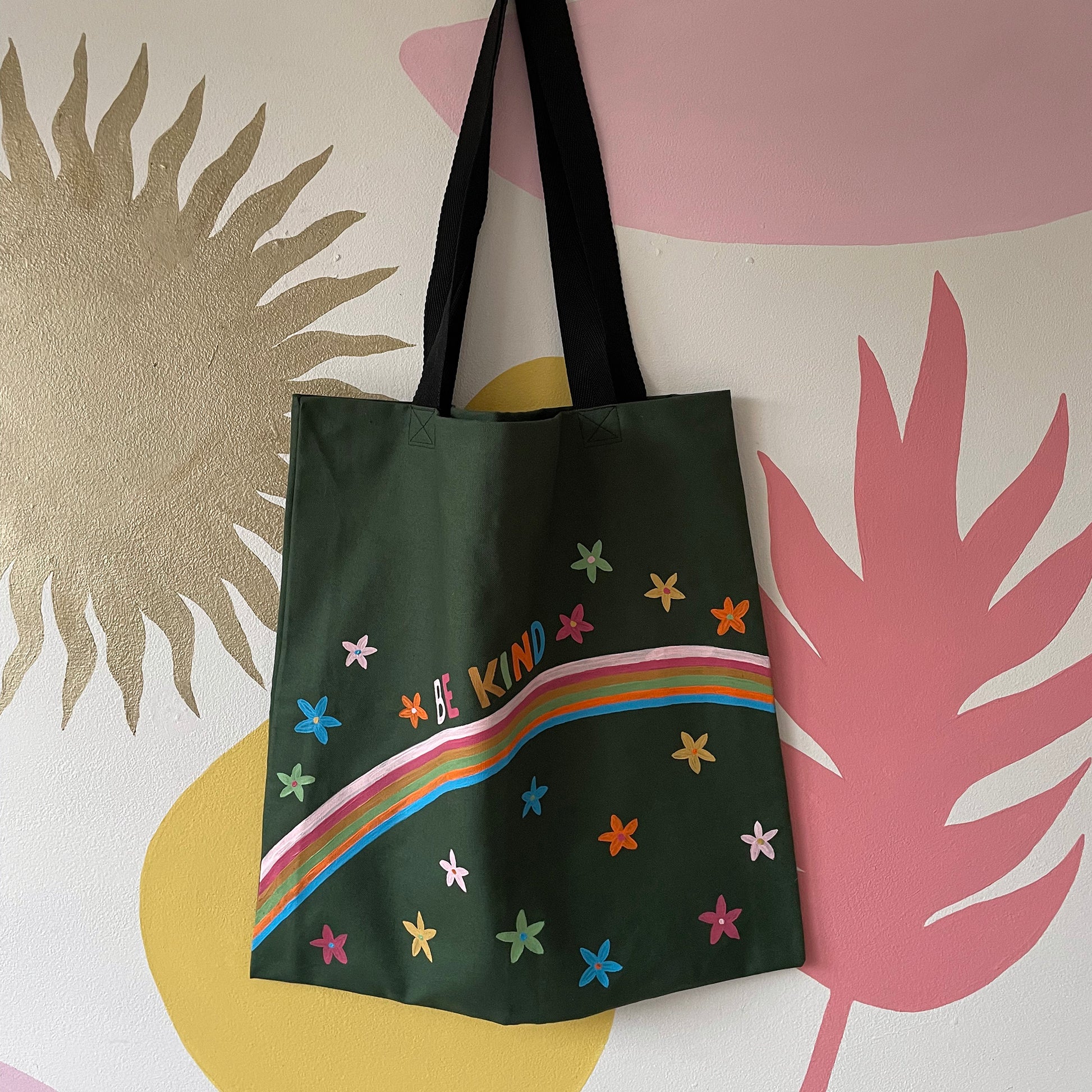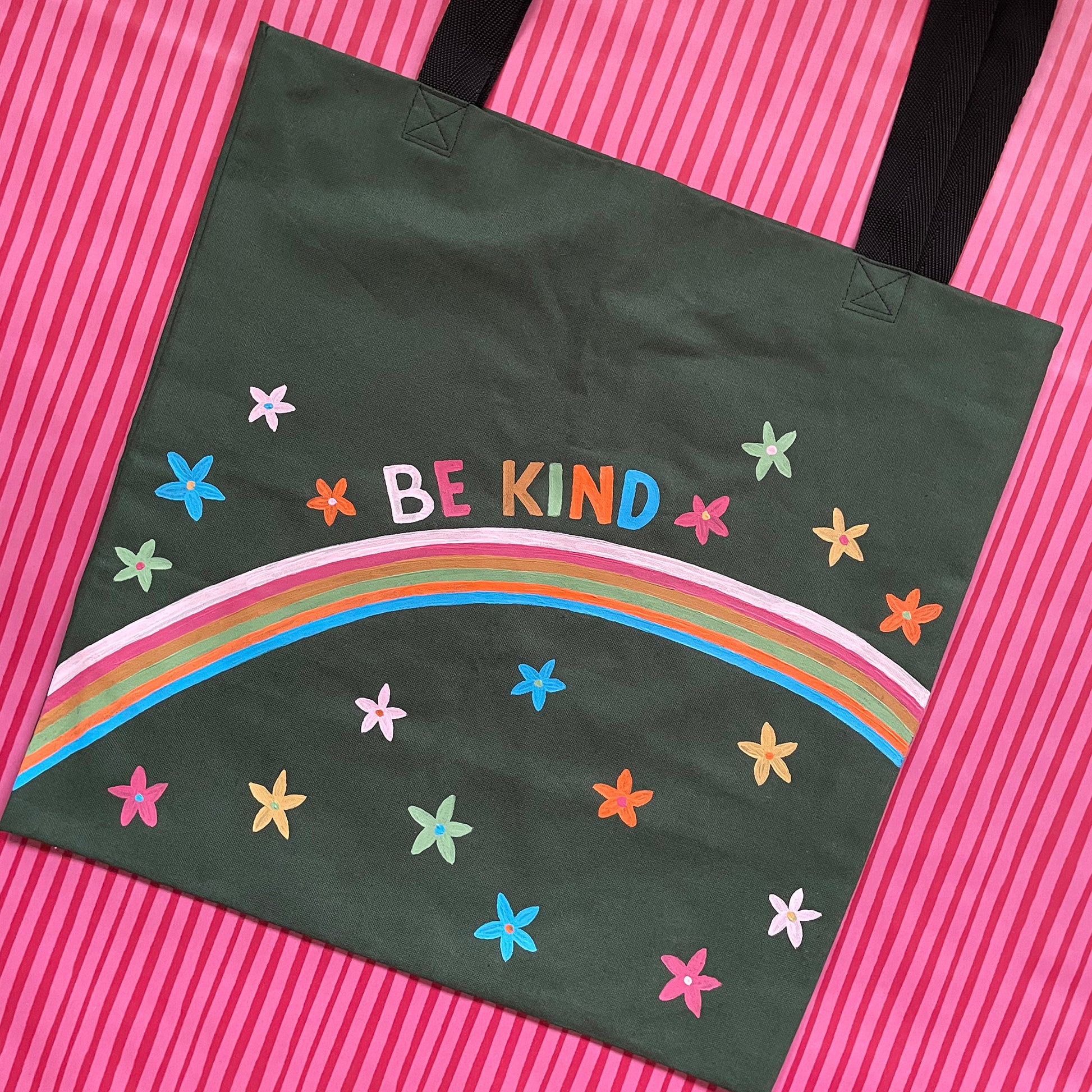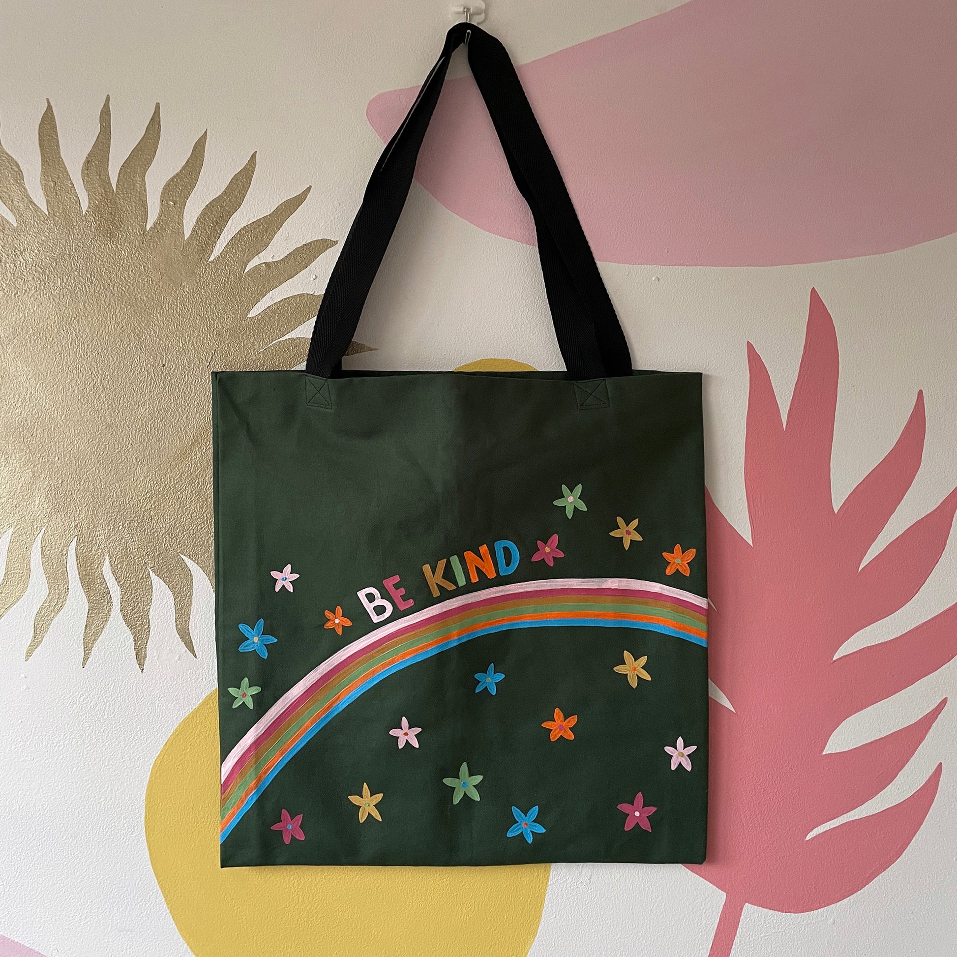 Spread positivity everywhere you go with this one of a kind hand painted tote bag. Made with durable, high-quality deep green canvas, this bag features a beautiful hand-painted design that is sure to turn heads. It's vibrant colours and message will remind you and everyone you meet, to always 'Be Kind'.