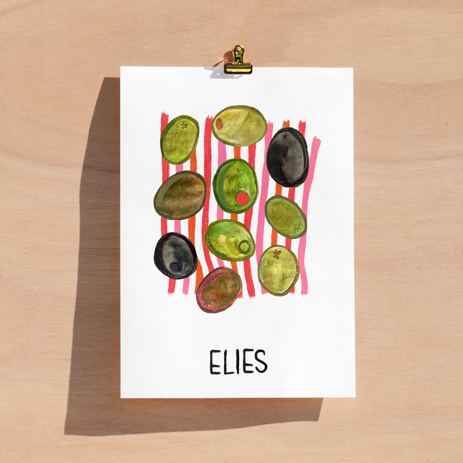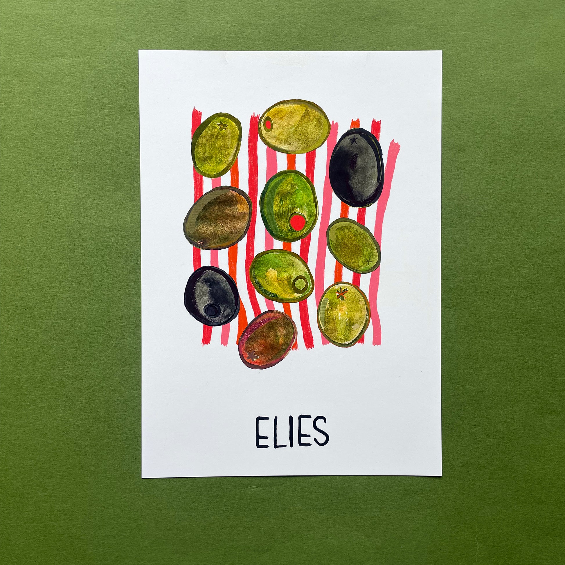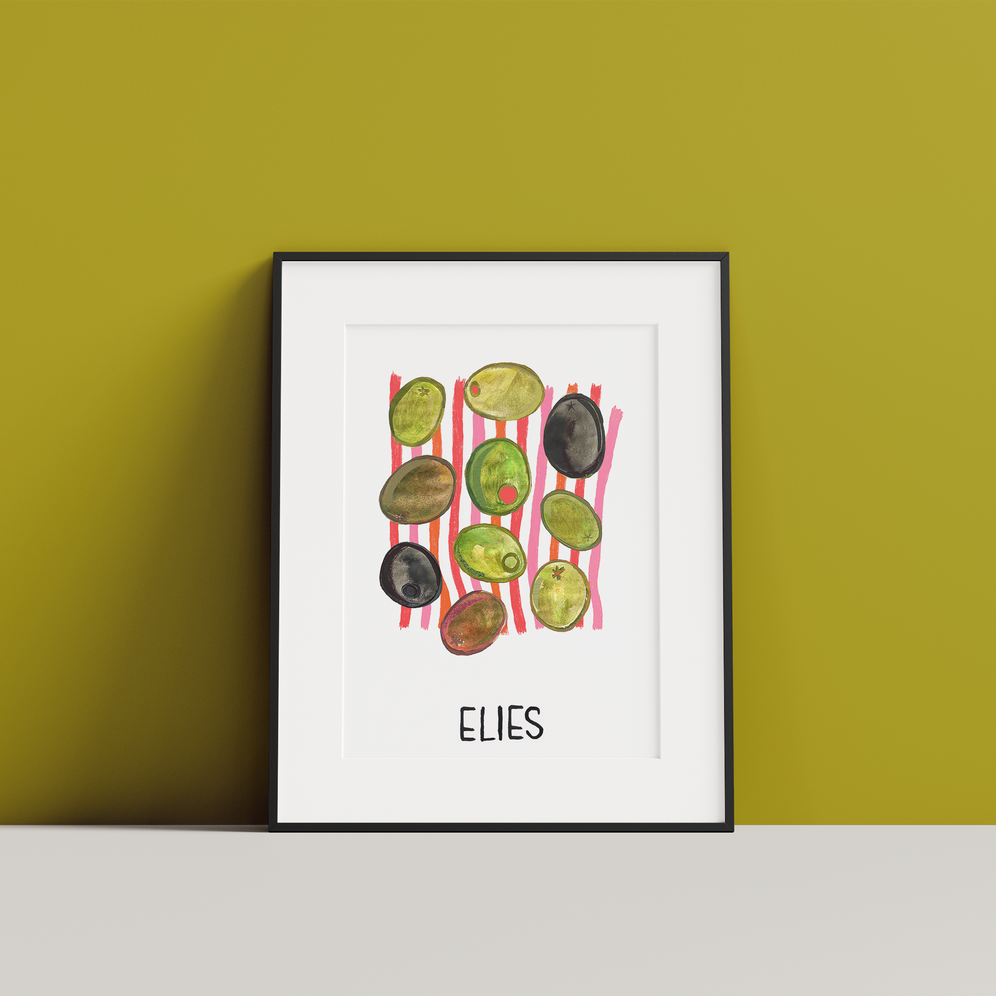 Bring a taste of the Mediterranean into your home with this bold and joyful print celebrating the humble olive. Featuring hand-painted olives in rich, earthy tones set against playful pink and orange stripes, this piece adds a splash of sunshine and a nod to European produce.